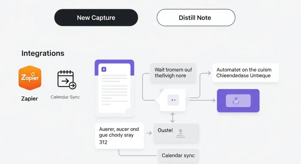 - Buttons: /button to “New Capture” (pre-fills date/tags) or “Distill Note” (copies to queue).