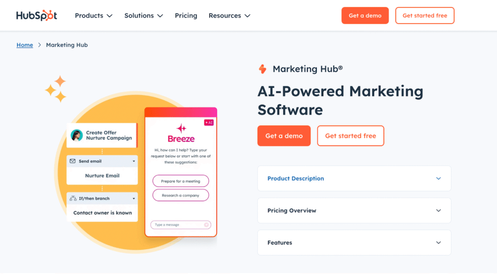 - Marketing Hub: Build campaigns with emails, landing pages, and social media.