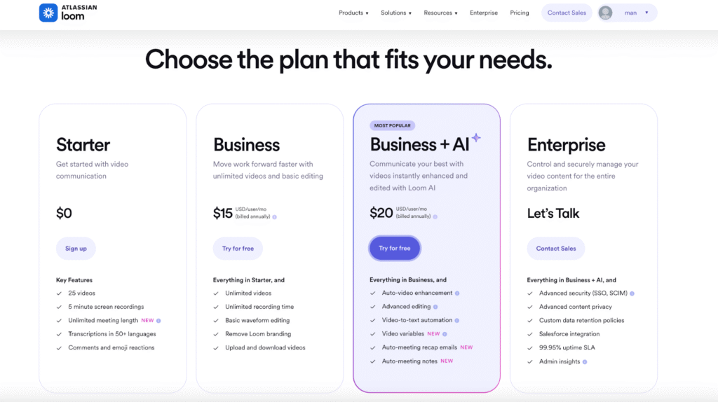 - Enterprise: SSO, advanced security, team features. Check www.loom.com for pricing.