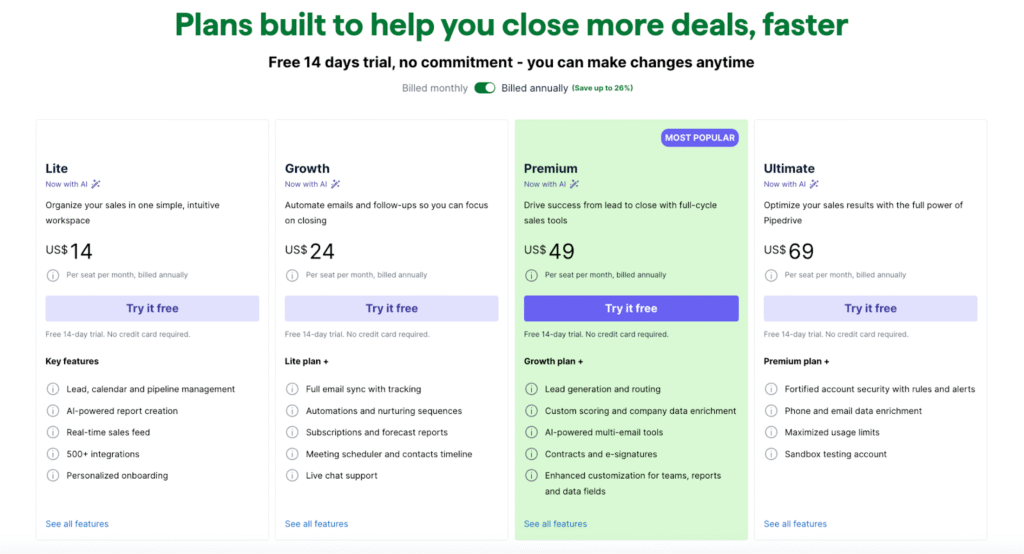 Pipedrive’s pricing is clear, with a 14-day free trial. Annual billing saves cash: